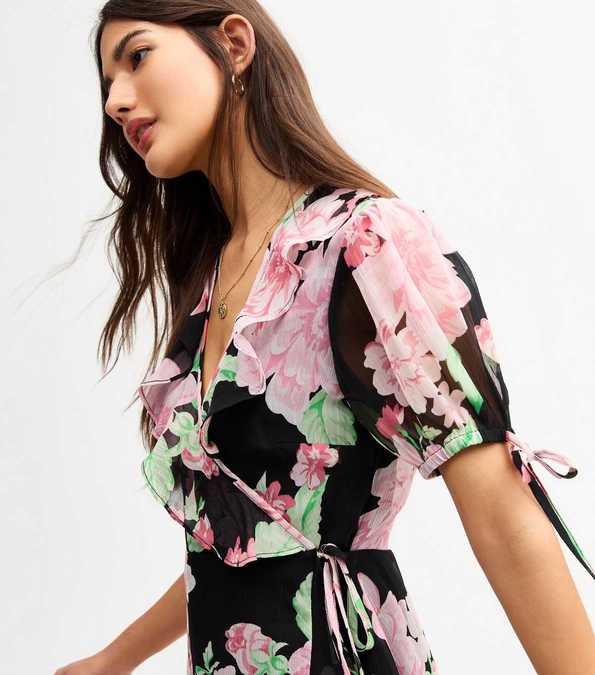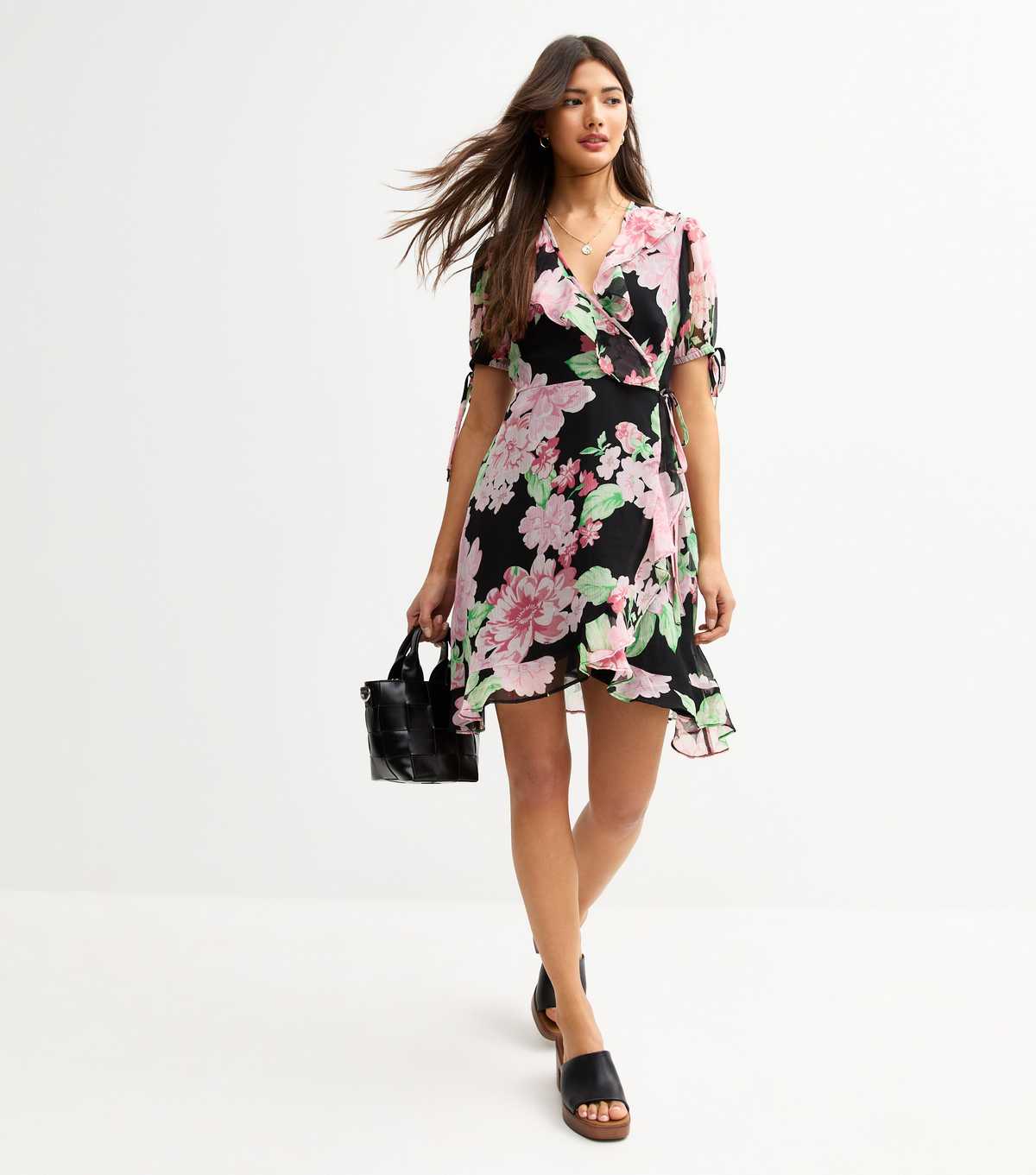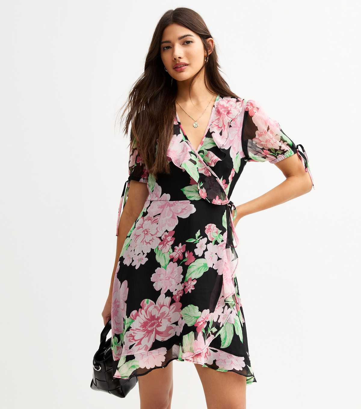 The pink floral print on this black mini dress will bring a romantic flourish to your summer wardrobe. Cut from flowing chiffon, the wrap style is finished with floaty frills.
